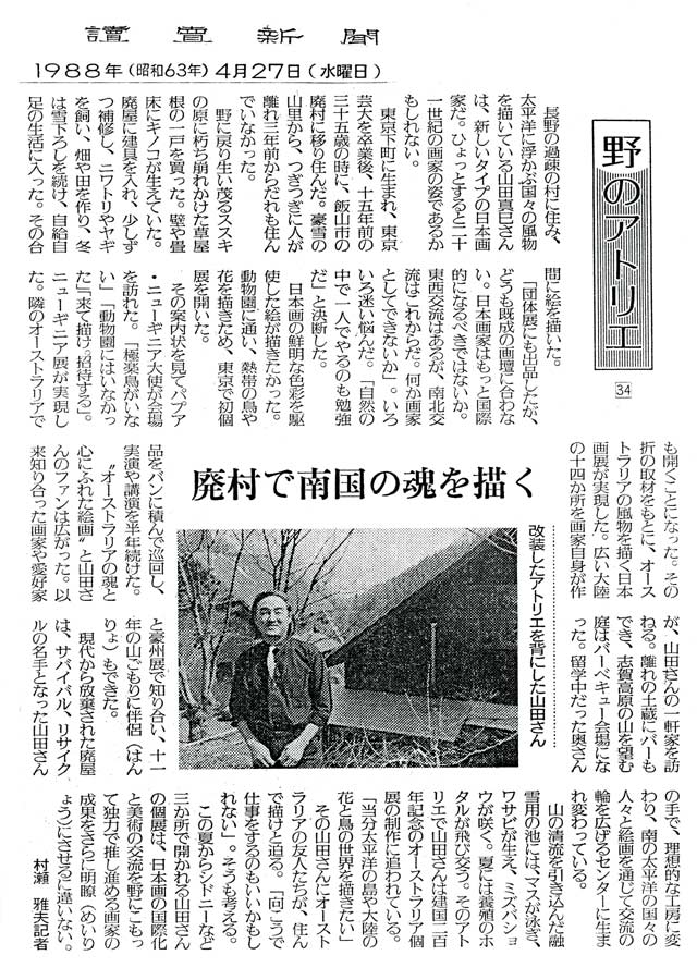 讀賣新聞(1988年4月27日) 廃村で南国の魂を描く |